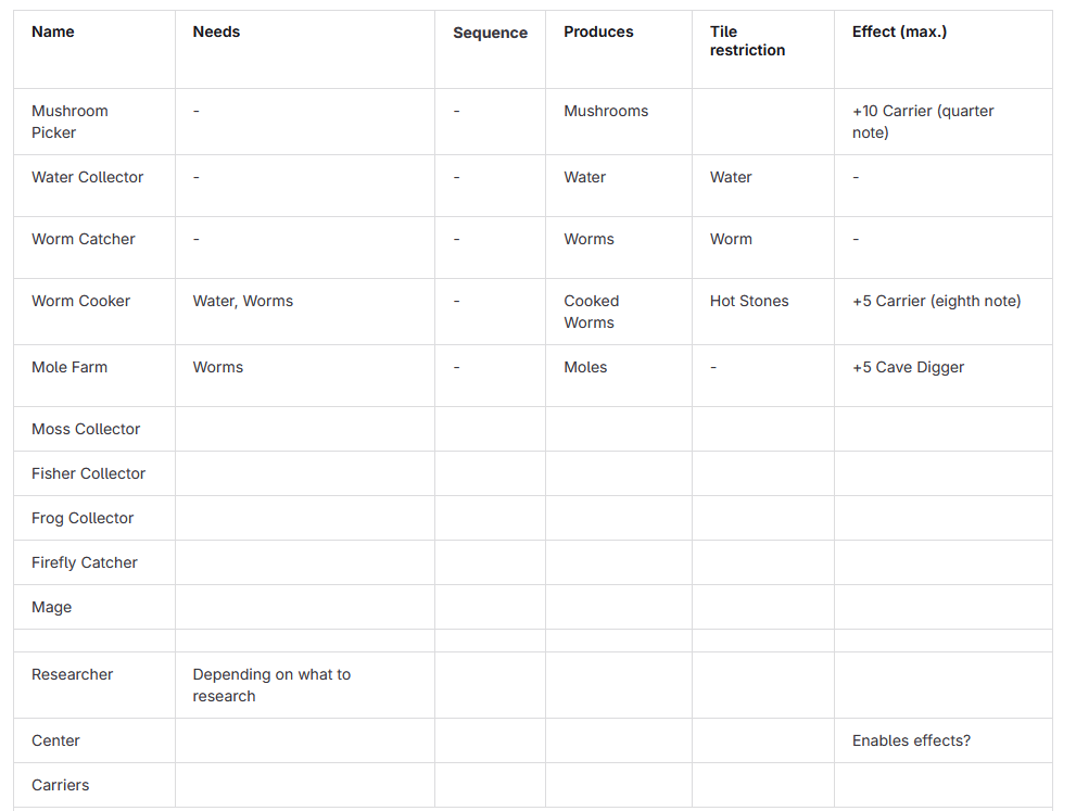 For example: The mushroom collector increases the number of carriers you can build — but only if it’s working efficiently. A well-synced worm cooker, on the other hand, unlocks faster carriers — five eighth-note carriers, to be exact. If your production chains aren’t optimized, the effects will be weaker or may not happen at all. But that’s still to come — right now, I need to implement:
