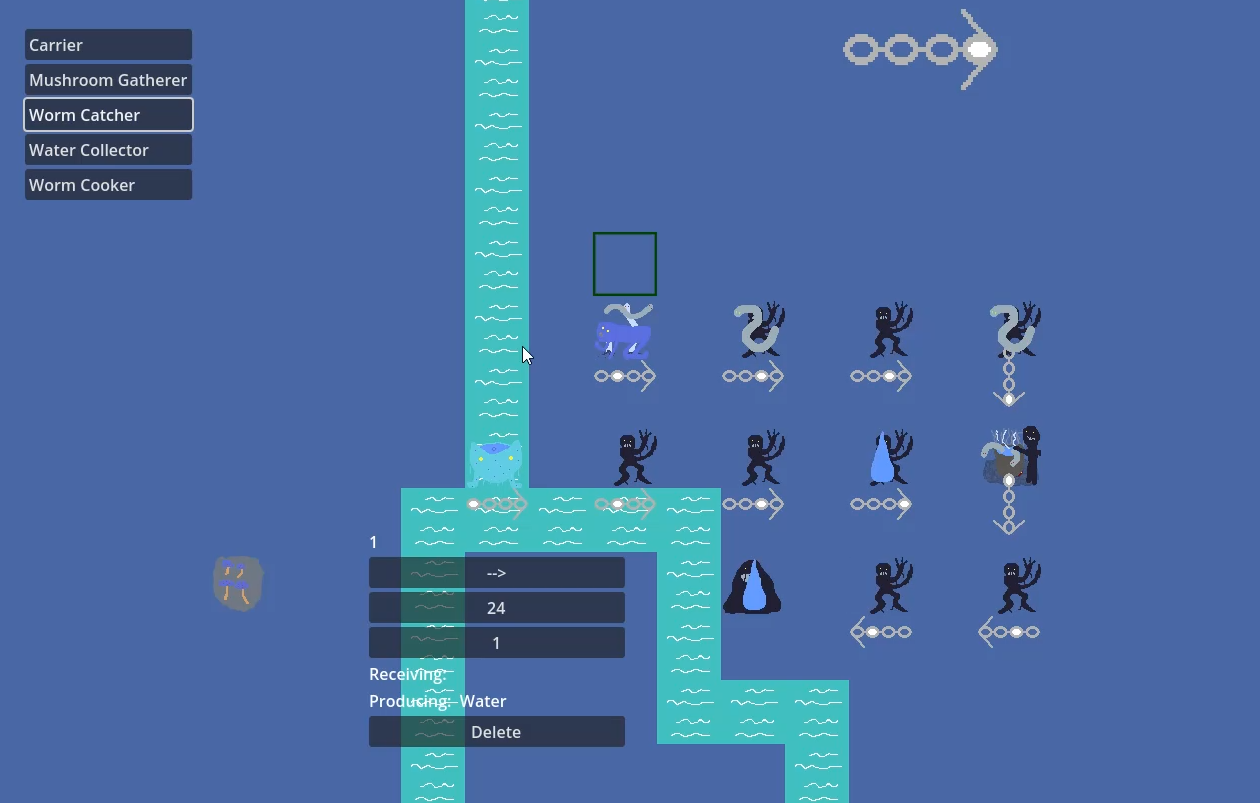 Up until now, each monster could only carry one item, stored in a current_good variable. I’ve now turned that into an array called current_goods, which makes it possible for monsters to hold multiple items. This is important for monsters like the worm cooker, which needs both worms and water to function.
